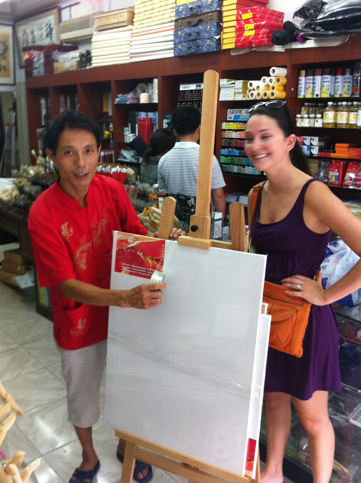 | The salesman Bri bargained with is taping the canvases to the easel so it would be easier to carry home. You can see how beaten down and weary he looks after Bri finished negotiating the price down :) |
