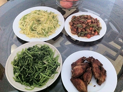 | This was another ayi dinner night this month. Chicken wings, chicken stir fried with peppers and carrots, some sort of green stuff and a delicious zucchini with garlic side dish. |
